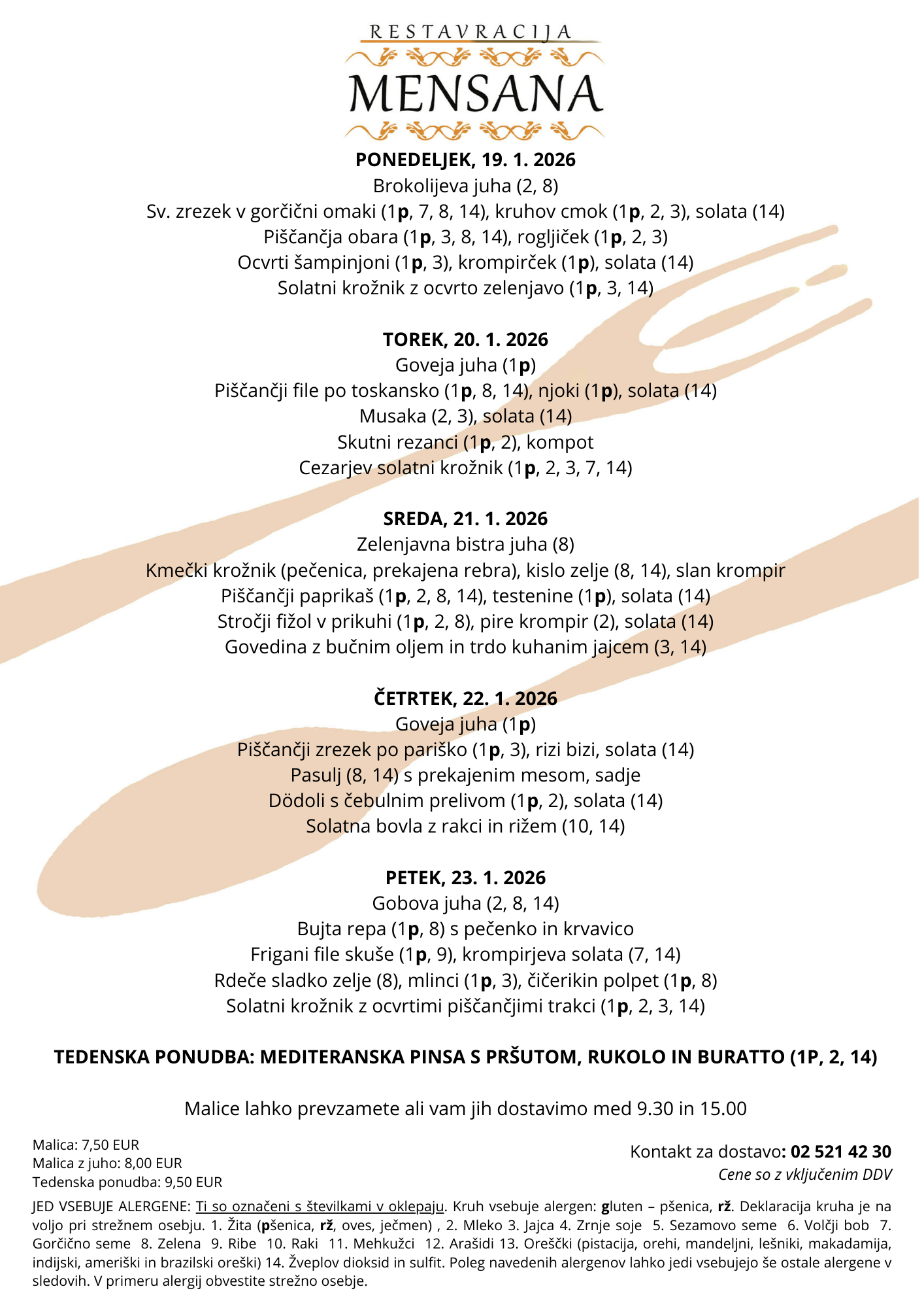 Vsak dan so na voljo tudi dnevna kosila, ocvrti piščanec, Francova župa, solatni krožniki, domači retaši in ostali jedi po naročilu. Brezplačna dostava v Murski Soboti z okolico in osebni prevzem hrane od ponedeljka do petka med 9.30 in 15.00 .